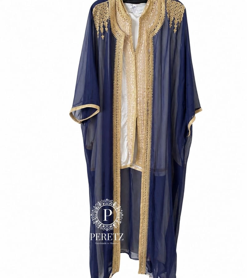 חליפת חתן מרוקאית הכוללת חולצה מכנס וסט ארוך בשילוב רקמה זהב.
